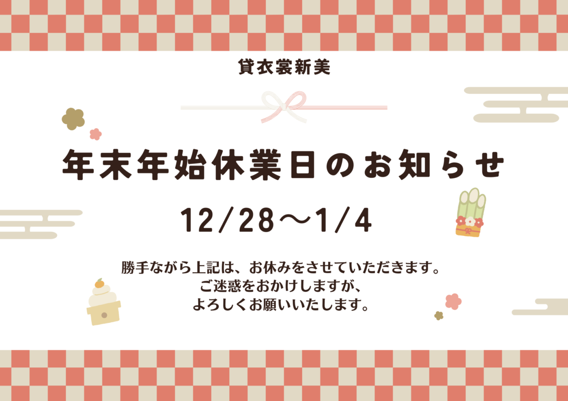 誠に勝手ながら、年末年始休業日を以下のとおりとさせていただきます。